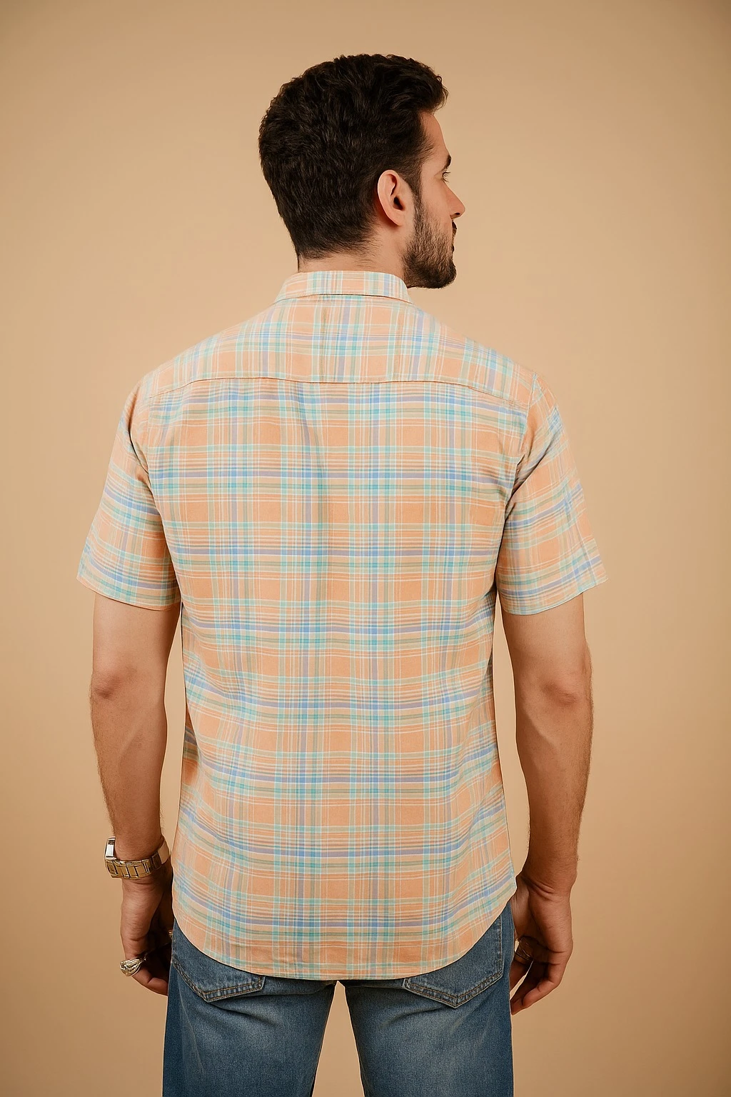 Discover the ultimate in casual style with our Apricot Orange Checked Regular Fit Cotton Shirt. Crafted from premium cotton, this half-sleeve shirt features a classic spread collar and convenient button closure, ensuring both comfort and style. The regular fit design offers a relaxed silhouette, perfect for everyday wear. Ideal for those seeking a versatile addition to their wardrobe, this checked shirt pairs effortlessly with jeans or chinos for a laid-back look. Elevate your casual fashion game with this must-have piece.