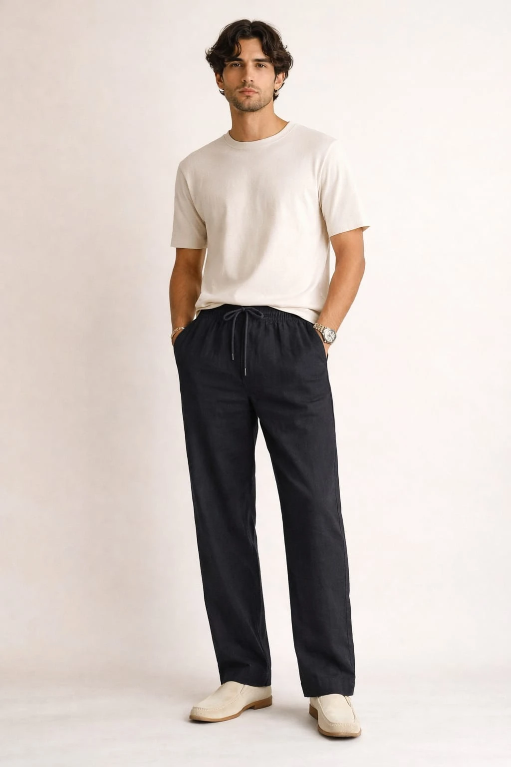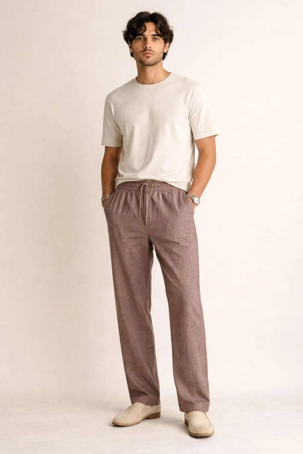 Featuring an elasticated waistband with adjustable drawstring, these pants provide a flexible and comfortable fit without compromising style. Side pockets add everyday practicality, while the minimal stitch detailing and smooth texture highlight the natural charm of linen. Finished in versatile earthy tones, they pair seamlessly with both casual and semi-formal outfits.