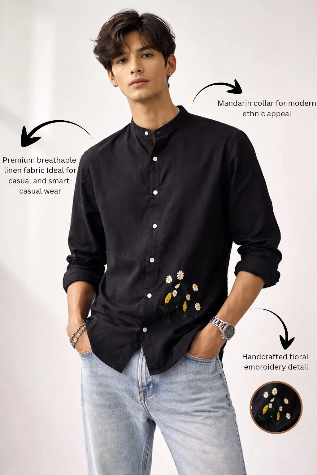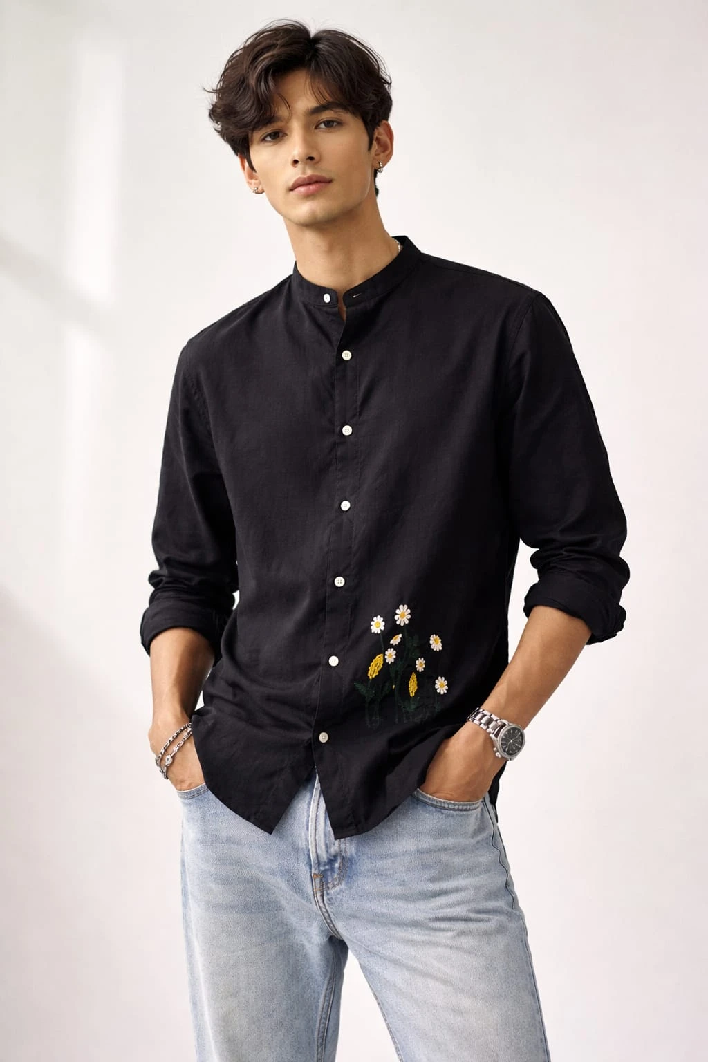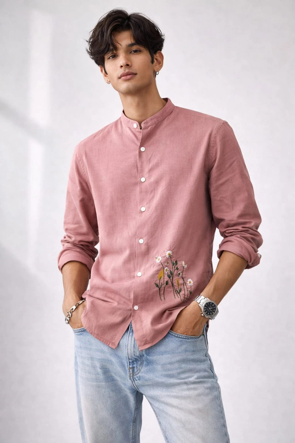 A delicate floral embroidery detail near the hem enhances the shirt with subtle artistic character, creating a unique statement without overpowering the design. The regular fit allows easy movement, while the soft-washed finish gives a smooth, premium feel against the skin. Finished with neatly rolled-up sleeves, this shirt pairs perfectly with denim or chinos for casual outings, festive gatherings, or smart-casual occasions.