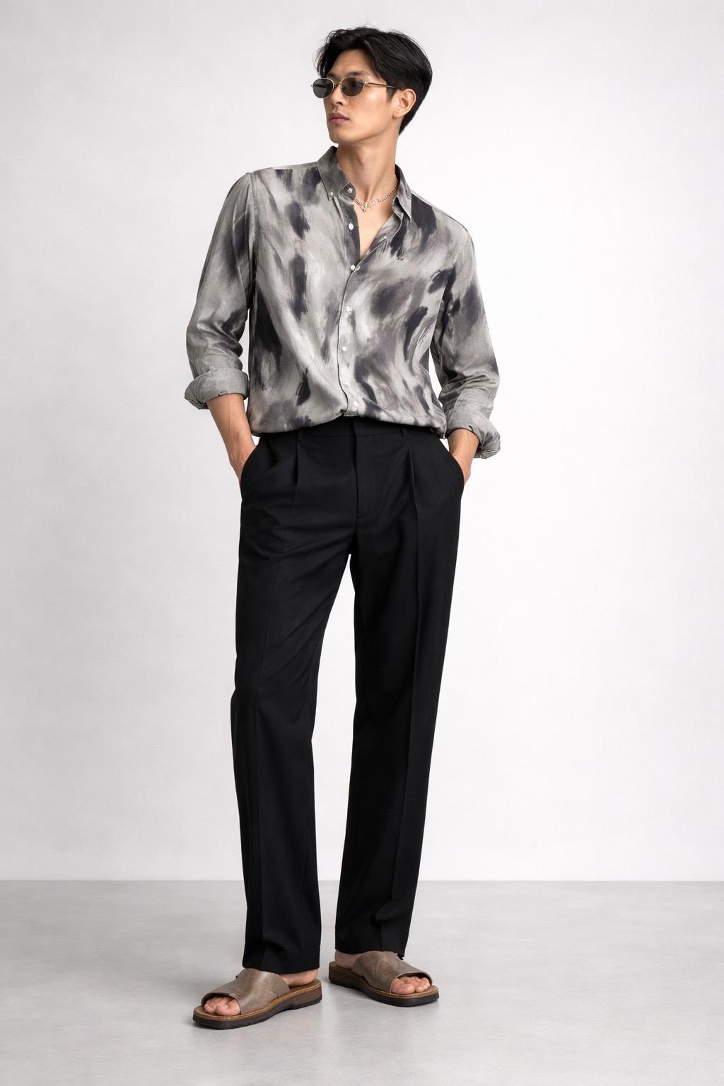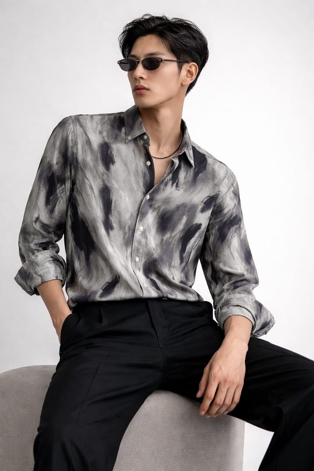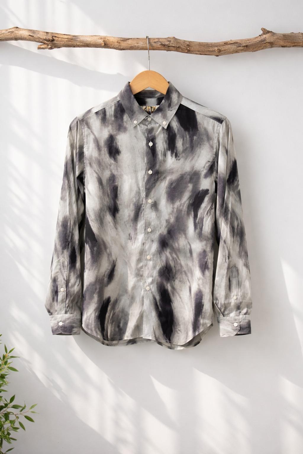 Elevate your wardrobe with this refined smoky ash grey shirt, designed to make a subtle yet striking statement. The fabric showcases an artistic blend of charcoal black abstract brushstroke accents, creating a fluid, ink-wash effect that feels both modern and effortlessly sophisticated.