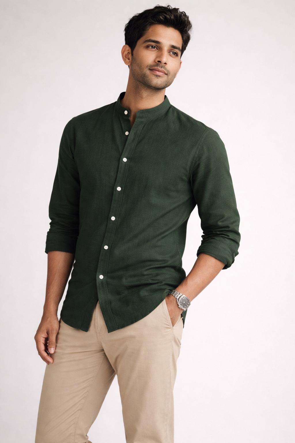 The shirt features a modern mandarin collar, a clean front button placket, and full-length sleeves with neatly finished cuffs, giving it a contemporary yet timeless appeal. The rich forest green tone adds depth and versatility, making it suitable for both casual and semi-formal occasions.