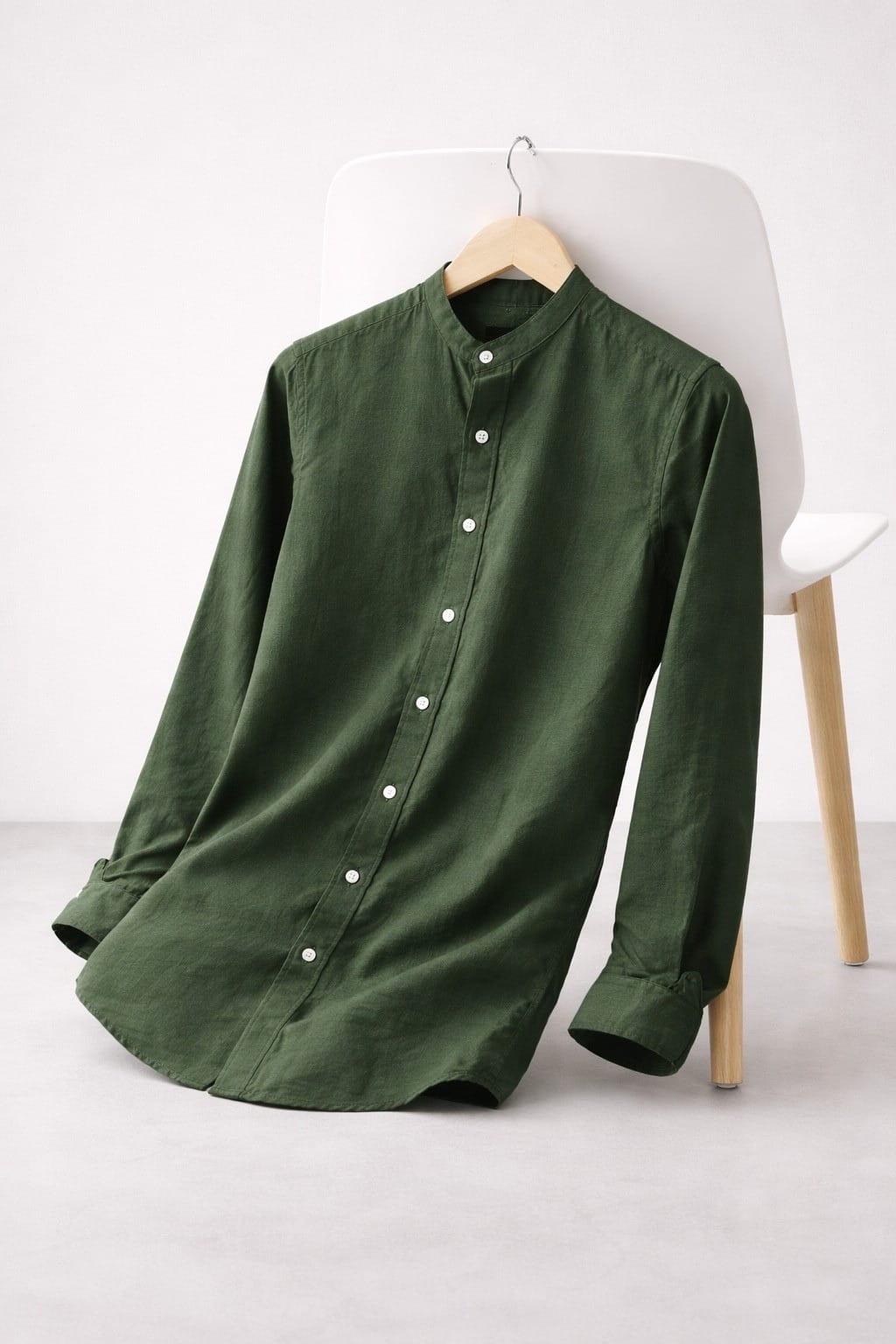 Deep Forest Green Linen Shirt – Mandarin Collar