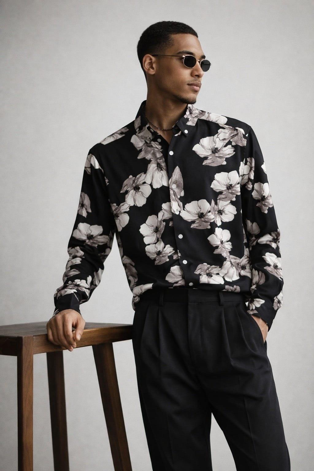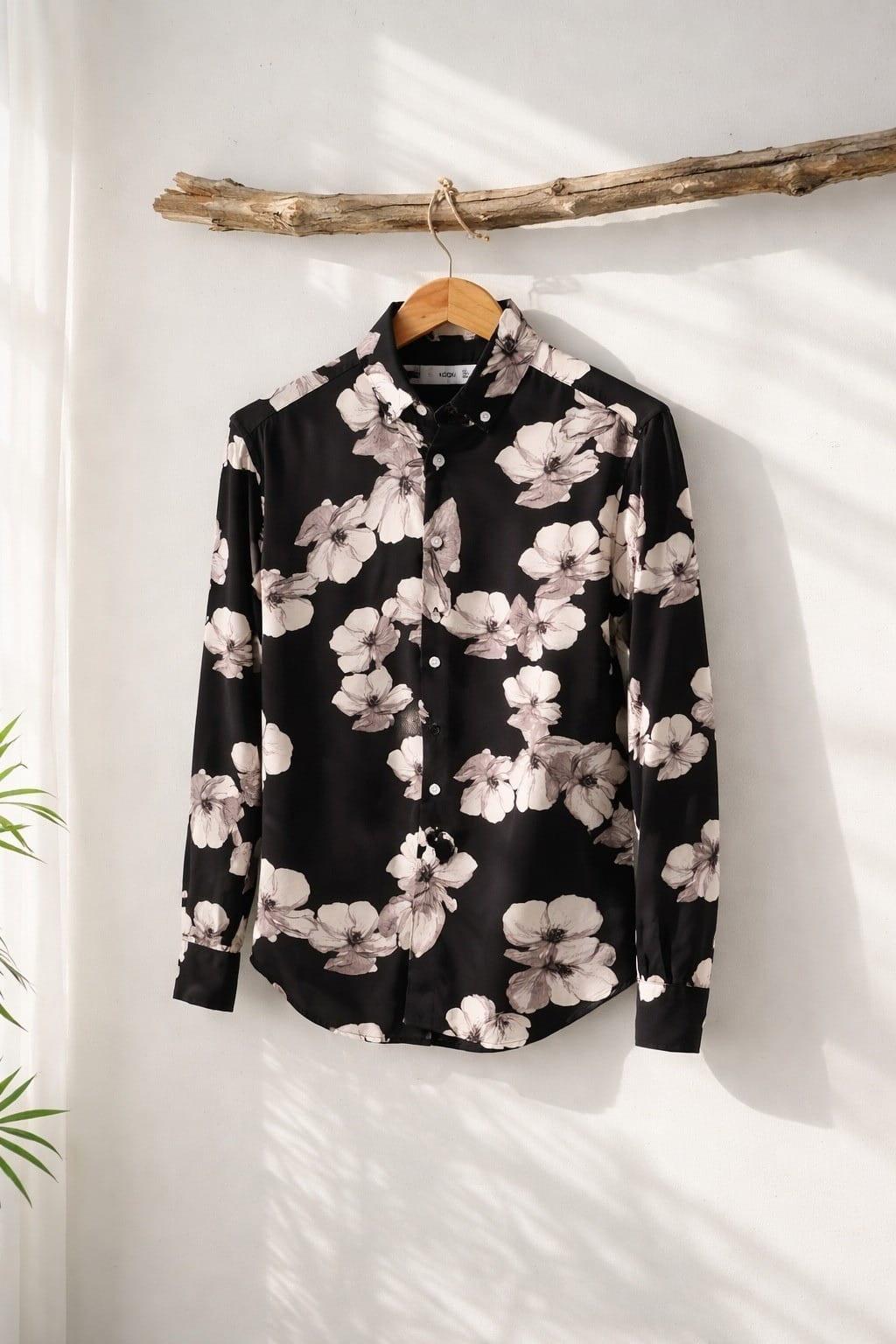 A refined statement piece, this shirt features a deep jet-black base adorned with oversized floral prints in soft ivory and muted taupe tones. The bold yet elegant pattern creates a striking visual contrast, perfect for modern, fashion-forward styling.