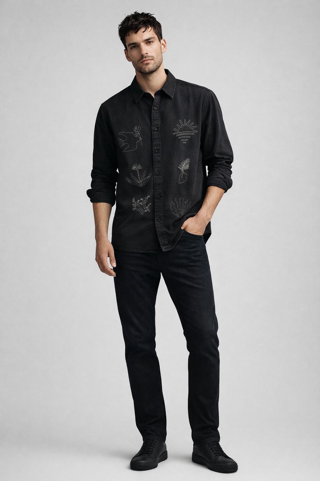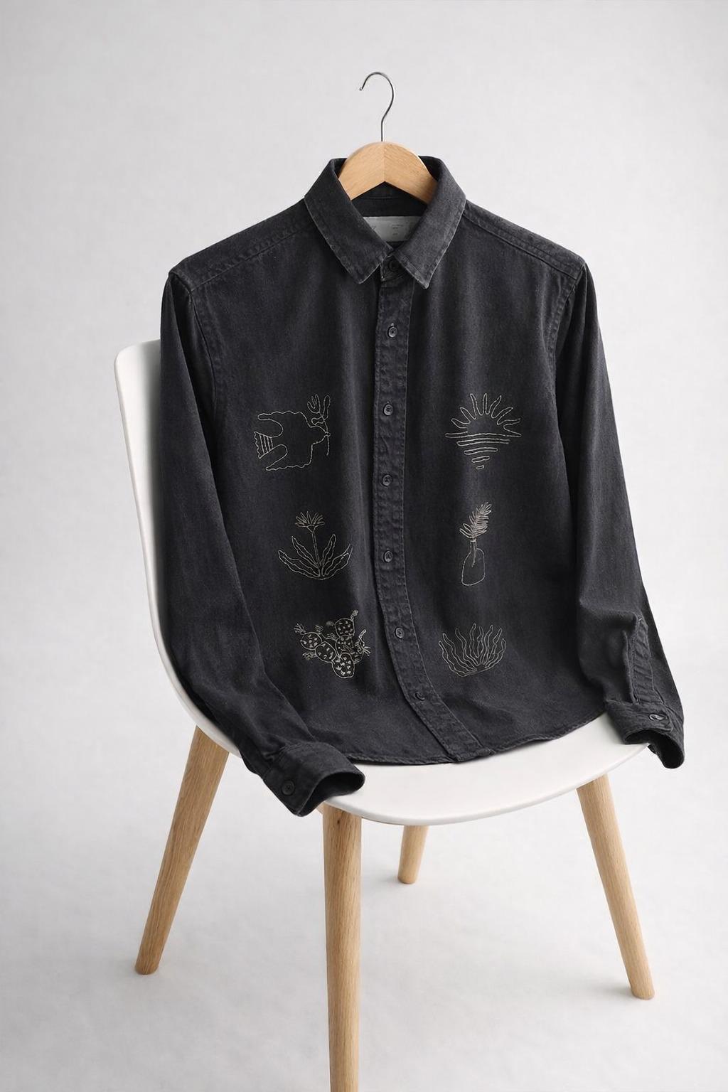 The subtle embroidered motifs—featuring organic shapes, botanical sketches, and abstract natural forms—add a refined, creative touch without overwhelming the clean, minimal design. Its versatile silhouette allows you to wear it buttoned up for a polished look or layered over a tee for a relaxed, contemporary vibe.