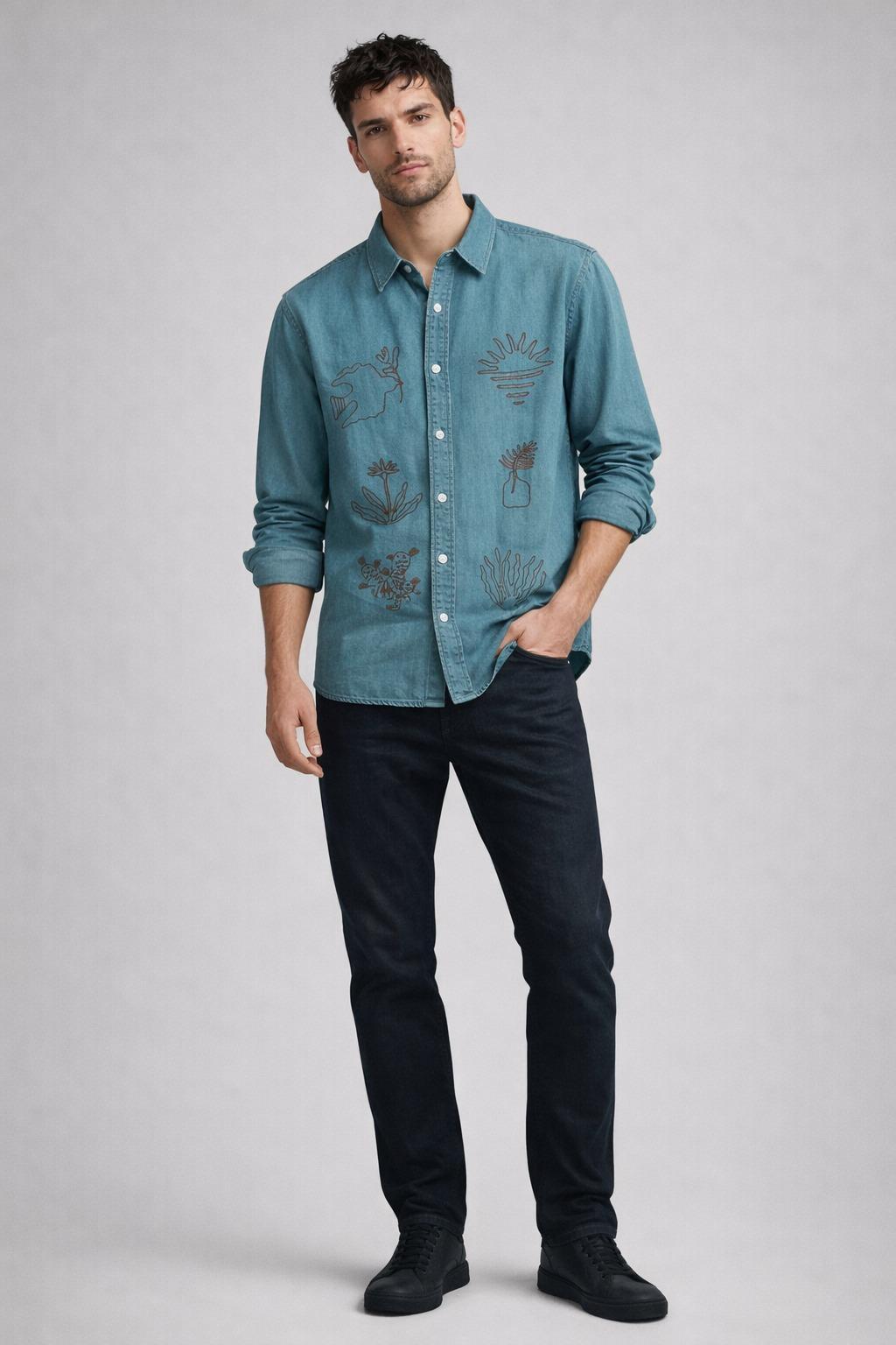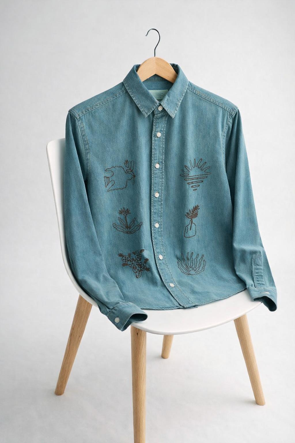 Elevate your everyday style with this denim shirt featuring unique minimalist line-art embroidery, inspired by nature and abstract botanical elements. Crafted from high-quality denim fabric, this shirt blends modern aesthetics with artistic detailing, making it a standout piece in any wardrobe.