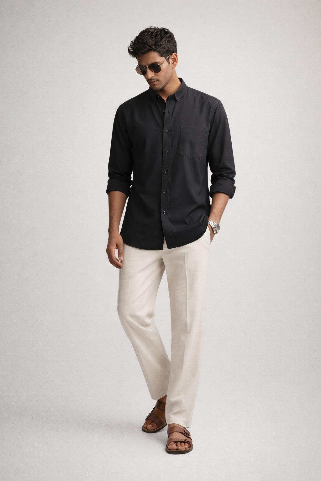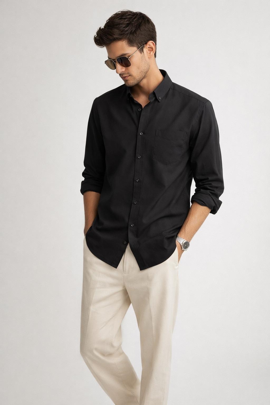 The classic black color adds a timeless appeal, making it versatile for both casual and semi-formal occasions. Featuring a structured collar, full button-down front, and a tailored fit, this shirt delivers a sharp and polished silhouette. The breathable fabric ensures ease of movement while maintaining a crisp appearance throughout the day.